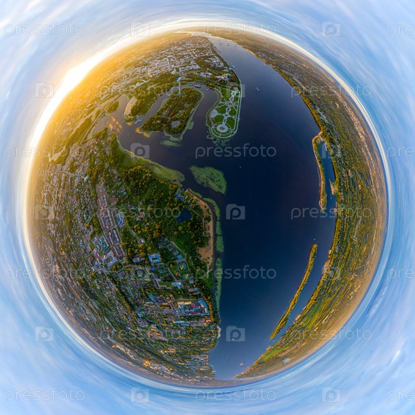 Ярославль, Россия. Парк на Косе (Косе). Панорамный вид на город. Которосль впадает в Волгу. Время заката. С высоты птичьего полета. 360-градусный панорамный астероид