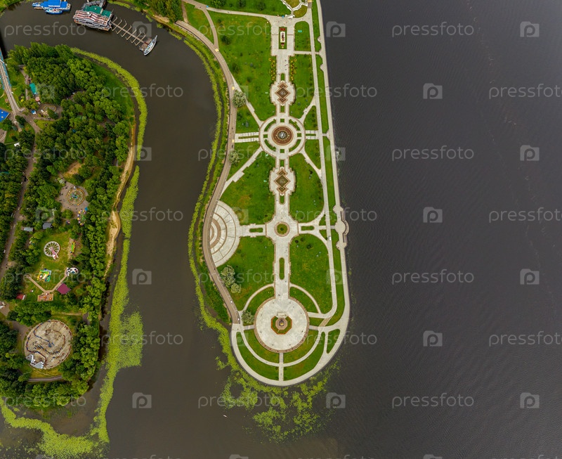 Ярославль, Россия. Стрелка, Парк на Стрелке - парк в историческом центре Ярославля. Которосль впадает в Волгу. Облачная погода. С высоты птичьего полета
