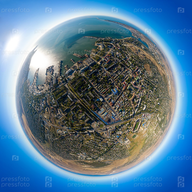 Керчь, Крым. Панорама города, порта и Крымского моста с высоты птичьего полета. 360-градусный панорамный астероид