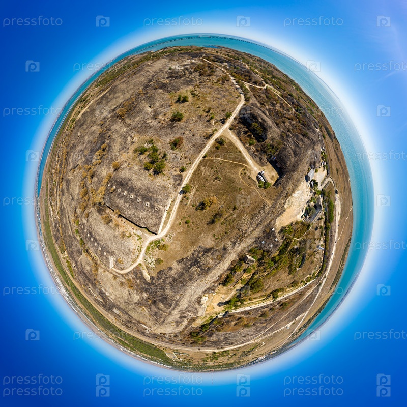 Керчь, Крым. Крепость Керчь - Артиллерийский форт 19 века с тоннелями и подземельями. С видом на Крымский мост. С высоты птичьего полета. 360-градусный панорамный астероид