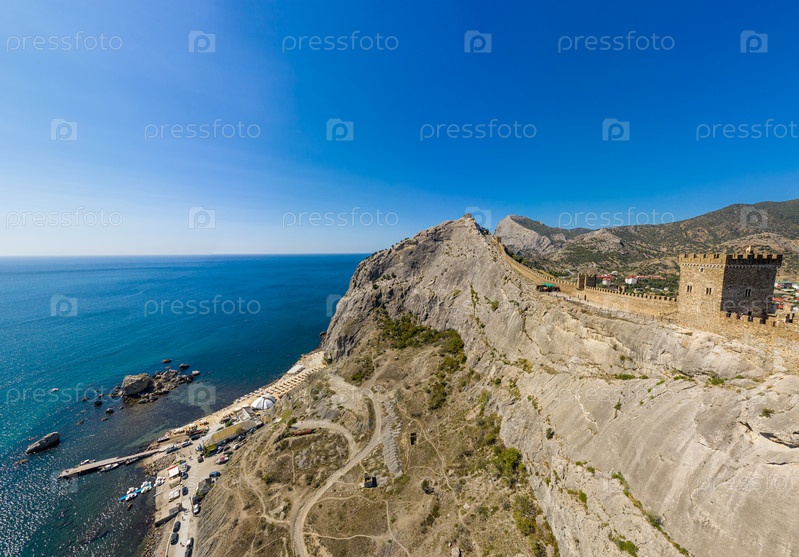 Судак, Крым. Генуэзская крепость. Вид с воздуха с Черного моря. Лето