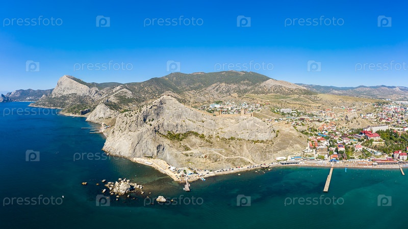 Судак, Крым. Генуэзская крепость. Вид с воздуха с Черного моря. Лето