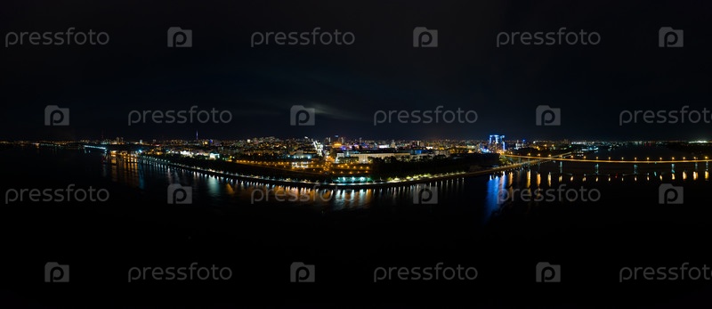 Пермь, Россия. Ночная панорама набережной Камы в городе Перми с Камского моста. С высоты птичьего полета