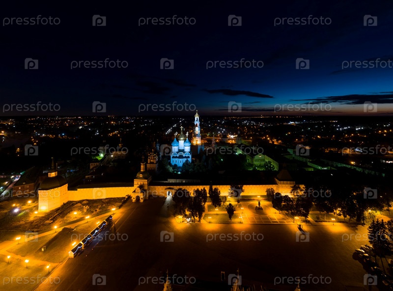 Сергиев Посад, Россия. Свято-Троицкая Сергиева Лавра. Красногорская площадь. Вид с воздуха ночью
