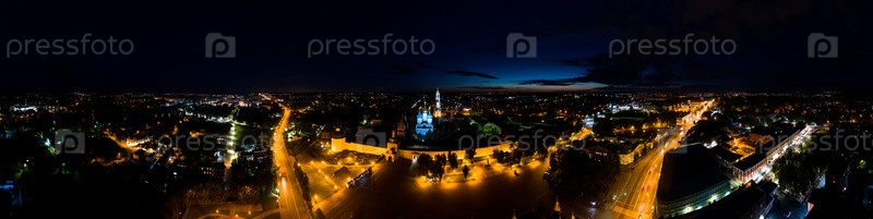 Сергиев Посад, Россия. Свято-Троицкая Сергиева Лавра. Красногорская площадь. Вид с воздуха ночью. Панорама 360