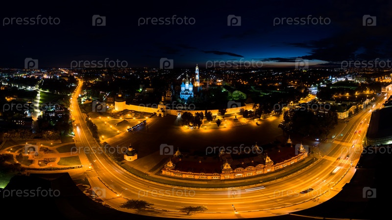 Сергиев Посад, Россия. Свято-Троицкая Сергиева Лавра. Красногорская площадь. Вид с воздуха ночью