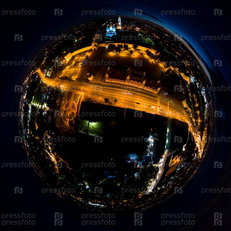 Сергиев Посад, Россия. Свято-Троицкая Сергиева Лавра. Красногорская площадь. Вид с воздуха ночью. 360-градусный панорамный астероид