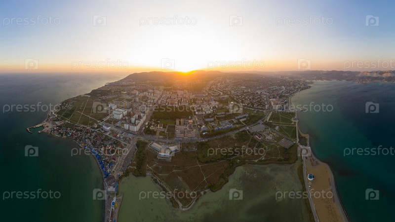 Новороссийск, Россия. Центральная часть города. Суджукская коса. Закат. С высоты птичьего полета