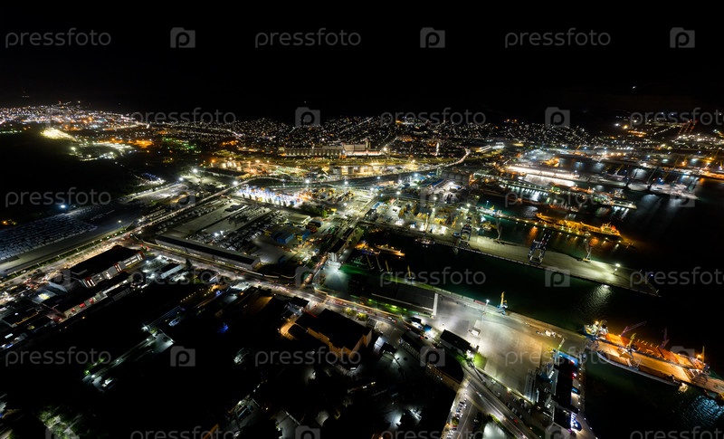 Новороссийск, Россия. Центральная часть города. Порт в Новороссийской бухте. Вид с воздуха ночью