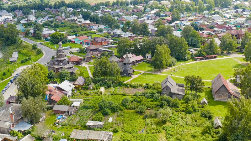 Суздаль, Россия. Полет. Преображенская церковь из села Козлятево, перевезенная в Суздаль - памятник деревянного зодчества середины 18 века, вид с воздуха