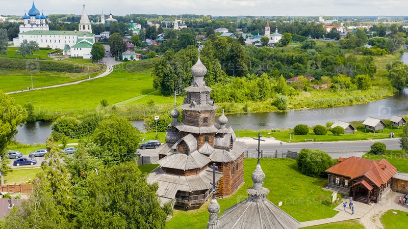 Суздаль, Россия. Полет. Деревянные ветряки, Преображенская церковь из села Козлятьево, Воскресенская церковь из села Патакино, Вид с воздуха
