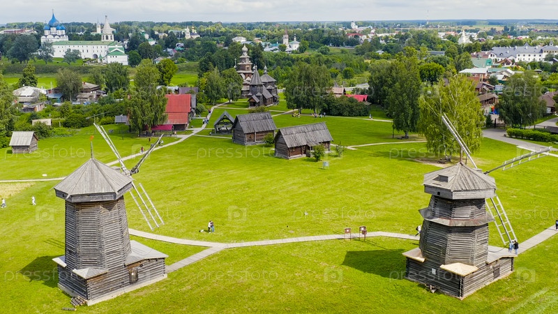 Суздаль, Россия. Полет. Деревянные ветряки, Преображенская церковь из села Козлятьево, Воскресенская церковь из села Патакино, Вид с воздуха