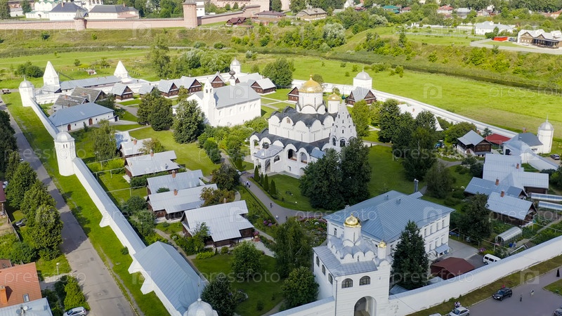 Суздаль, Россия. Собор Покрова Пресвятой Богородицы в Покровском монастыре, вид с воздуха