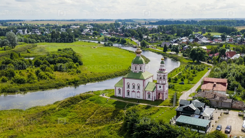 Суздаль, Россия. Полет. Церковь Ильи Пророка на Ивановой горе или Ильинская церковь - храм в Суздале в излучине реки Каменки, вид с воздуха