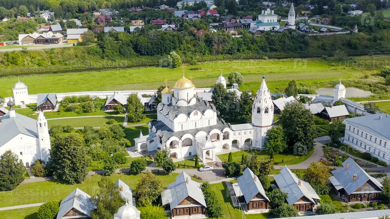 Суздаль, Россия. Собор Покрова Пресвятой Богородицы в Покровском монастыре, вид с воздуха