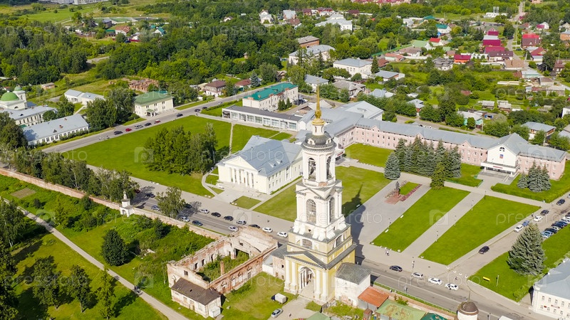 Суздаль, Россия. Полет. Ризоположенский монастырь — один из древнейших монастырей России, основанный в 1207 году. Преподобная колокольня, вид с воздуха