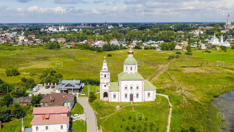 Суздаль, Россия. Полет. Церковь Ильи Пророка на Ивановой горе или Ильинская церковь - храм в Суздале в излучине реки Каменки, вид с воздуха