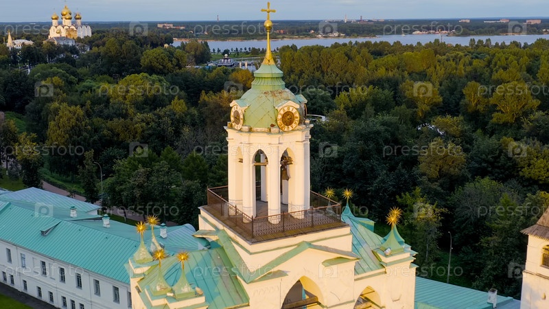 Ярославль, Россия. Звонница Ярославского Спасо-Преображенского монастыря (Спасо-Ярославский монастырь) — старинный мужской монастырь в Ярославле. Время заката, Вид с воздуха