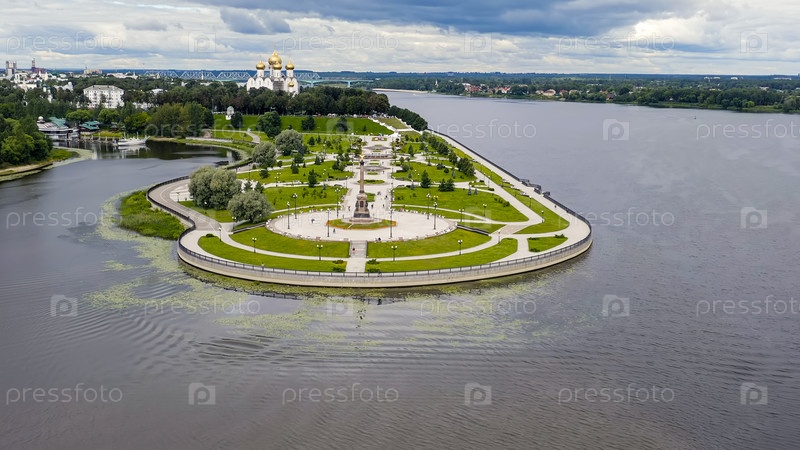 Ярославль, Россия. Стрелка, Которосль впадает в реку Волгу, и где, по преданию, князь Ярослав Мудрый основал город Ярославль, вид с воздуха