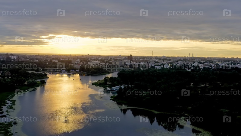 Ярославль, Россия. Ярославский Спасо-Преображенский мужской монастырь (Спасо-Ярославский монастырь) — старинный мужской монастырь в Ярославле. Время заката, Вид с воздуха