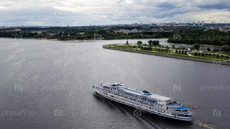 Россия, Ярославль - 14 августа 2020 г.: Круизный лайнер "Павел Божев" проходит по Волге вдоль парка на Стрелке (Стрелке), вид с воздуха
