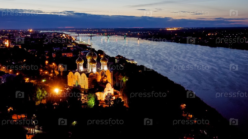 Ярославль, Россия. Собор Успения Пресвятой Богородицы (Успенский собор). Огни города после захода солнца, сумерки, вид с воздуха