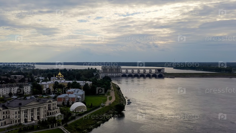 Углич, Россия. Угличская ГЭС на реке Волге в Ярославской области. Часть Волжско-Камского каскада ГЭС, вид с воздуха