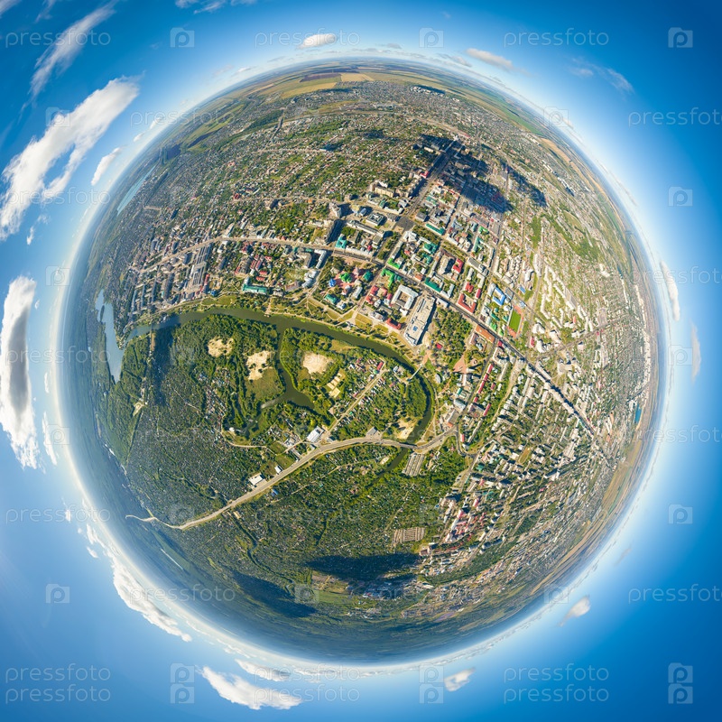 Тамбов, Россия. Панорама города с воздуха летом. Ясная погода с облаками. 360-градусный воздушный панорамный астероид