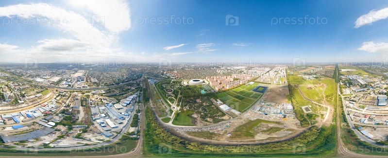 Краснодар, Россия. Панорама города летом. Парк в городе Краснодар. Футбольные площадки. Панорама 360, вид с воздуха