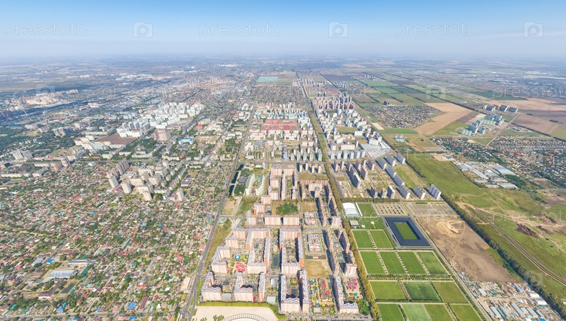 Краснодар, Россия. Панорама города летом. Парк в городе Краснодар. Футбольные площадки. С высоты птичьего полета