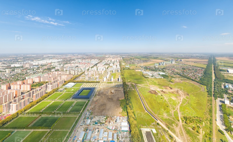 Краснодар, Россия. Панорама города летом. Парк в городе Краснодар. Футбольные площадки. С высоты птичьего полета