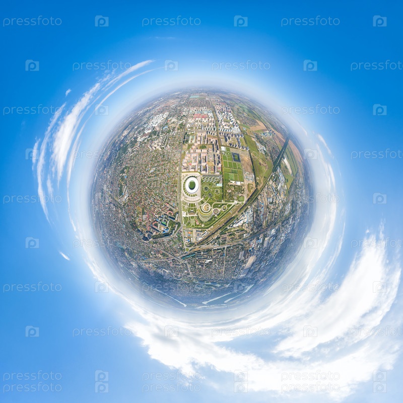 Краснодар, Россия. Панорама города летом. Парк в городе Краснодар. Футбольные площадки. 360-градусный воздушный панорамный астероид