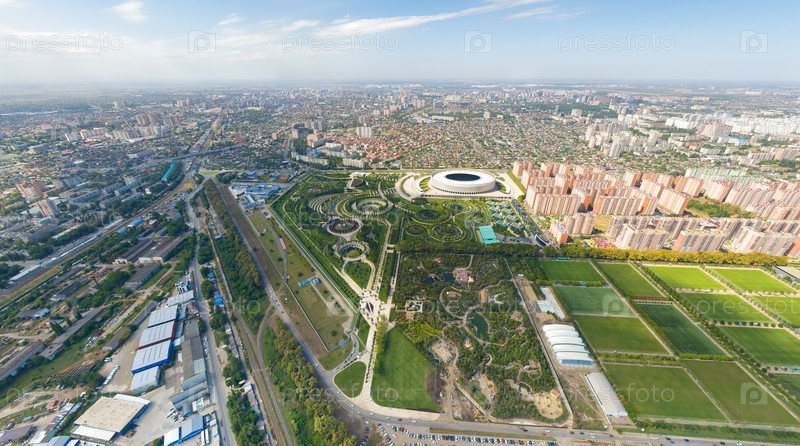 Краснодар, Россия. Панорама города летом. Парк в городе Краснодар. Футбольные площадки. С высоты птичьего полета