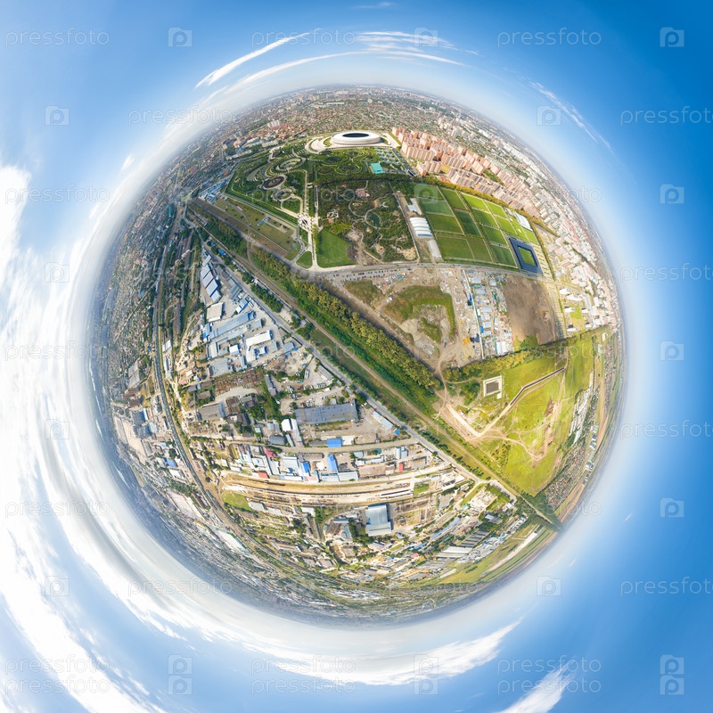 Краснодар, Россия. Панорама города летом. Парк в городе Краснодар. Футбольные площадки. 360-градусный воздушный панорамный астероид