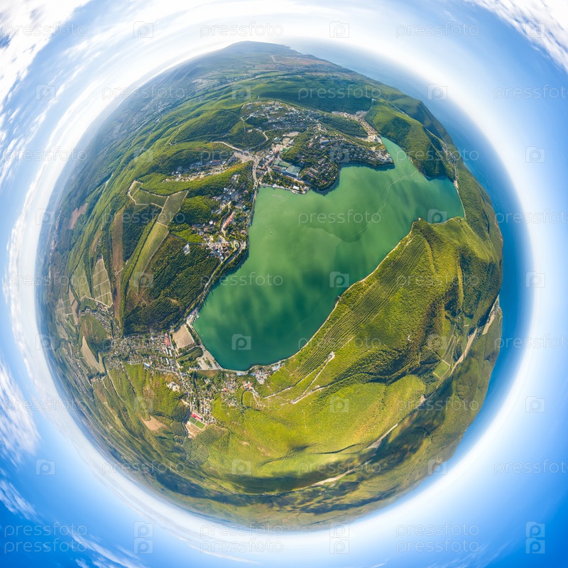 Абрау-Дюрсо, Россия. Вид на озеро Обрао, горы, Черное море и виноградники. Лето. 360-градусный воздушный панорамный астероид