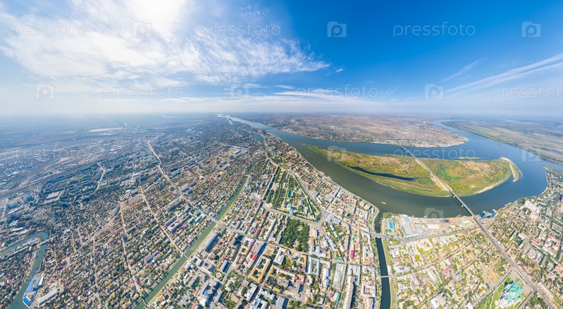 Астрахань, Россия. Панорама города с воздуха летом. Река Волга и остров Городстой. С высоты птичьего полета