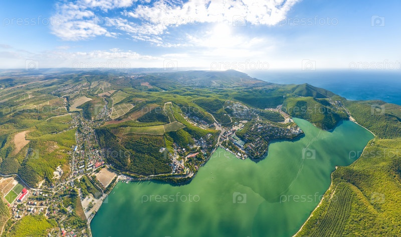 Абрау-Дюрсо, Россия. Вид на озеро Обрао, горы, Черное море и виноградники. Лето. С высоты птичьего полета