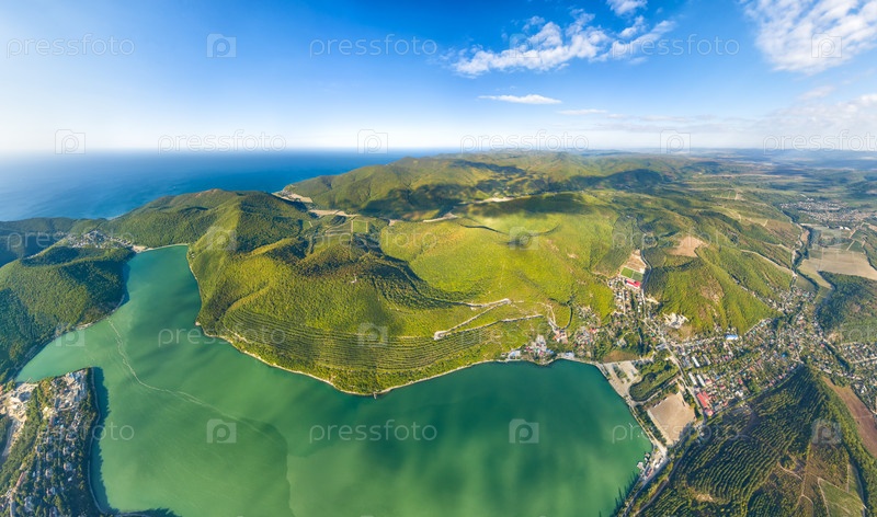 Абрау-Дюрсо, Россия. Вид на озеро Обрао, горы, Черное море и виноградники. Лето. С высоты птичьего полета