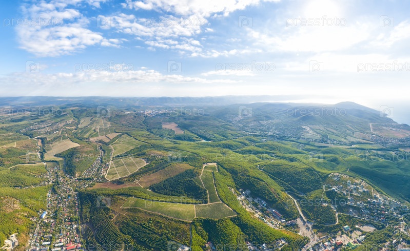 Абрау-Дюрсо, Россия. Вид на горы и виноградники. Лето. С высоты птичьего полета