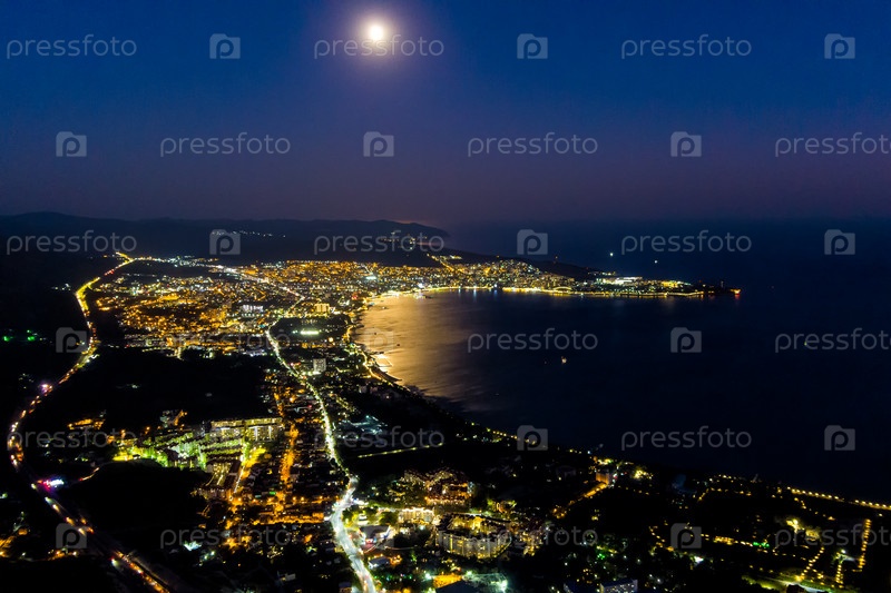 Геленджик, Россия. Вид на ночной город, залив и луну. Лето. С высоты птичьего полета