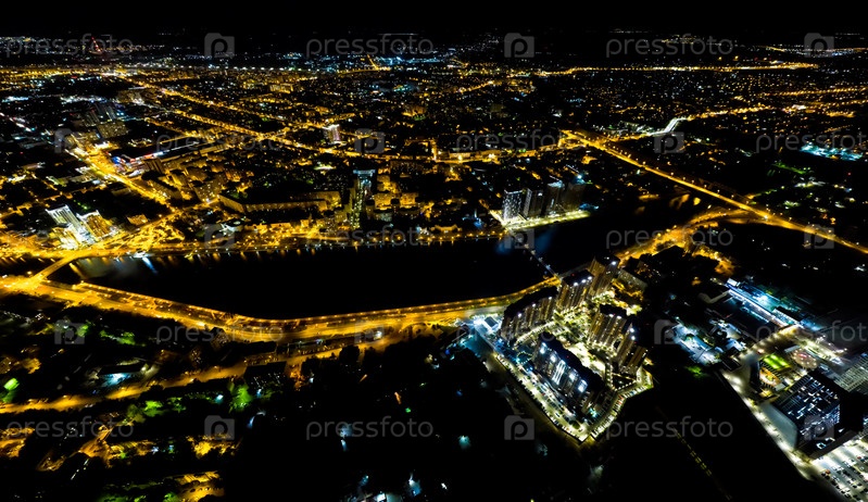 Астрахань, Россия. Панорама города с воздуха. Огни ночного города. С высоты птичьего полета