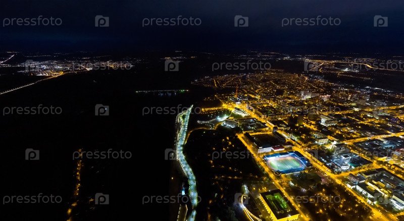 Уфа, Россия. Панорама центра города. Огни ночного города. С высоты птичьего полета