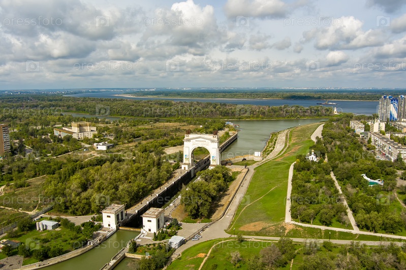 Волгоград, Россия. Волго-Донской канал. Первый шлюз. С высоты птичьего полета
