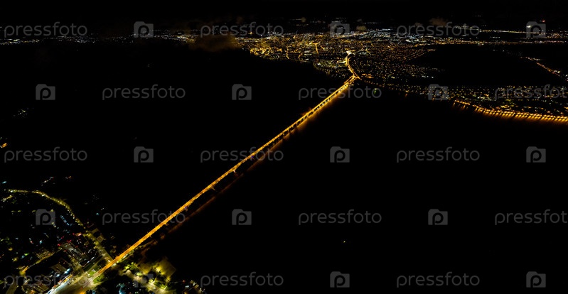 Саратов, Россия. Огни ночного города. Саратовский мост. Набережная реки Волги. С высоты птичьего полета