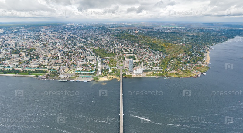 Саратов, Россия. Панорама города и Саратовского моста через Волгу. Облачная погода. С высоты птичьего полета