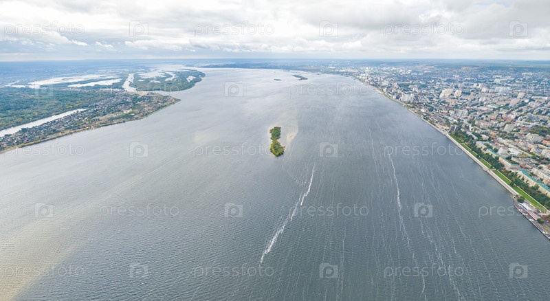 Саратов, Россия. Вид на реку Волгу. Кроличий остров. Облачная погода. Лето. С высоты птичьего полета