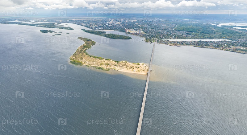 Саратов, Россия. Панорама города и Саратовского моста через Волгу. Мост соединяет Саратов и Энгельс. Облачная погода. С высоты птичьего полета