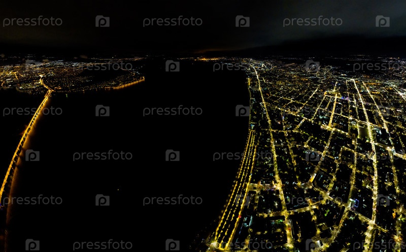 Саратов, Россия. Огни ночного города. Саратовский мост. Набережная реки Волги. С высоты птичьего полета