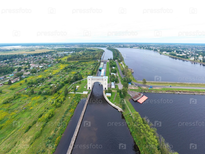 Углич, Россия. Круизный лайнер и сухогруз типа "Волга-Дон" у шлюзовых ворот Угличского водохранилища. С высоты птичьего полета