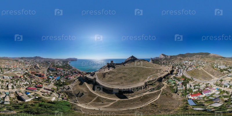 Судак, Крым. Генуэзская крепость. Вид на городские пляжи Судака. Панорама 360. Вид с воздуха. Лето